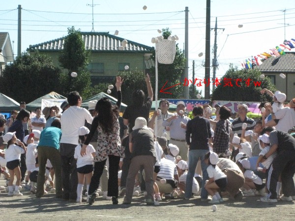 嫌々ながらも途中からスイッチが入って子供を押しのけての玉入れw